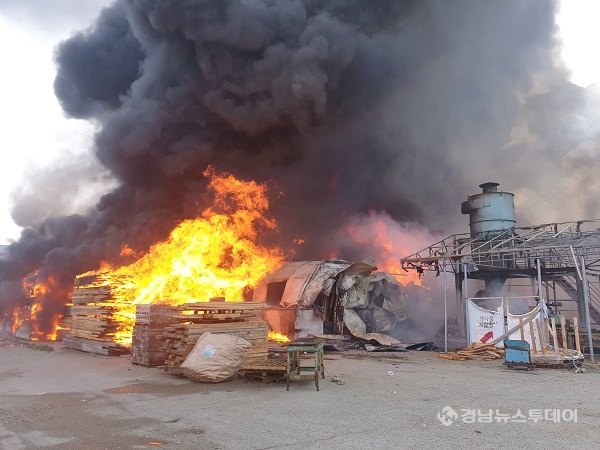 (김해=경남뉴스투데이) 24일 오전 9시 11분경 김해시 상동면 소재 목재가공 공장과 폐비닐 재활용 공장, 우레탄 폼 제조공장 등에서 화재가 발생했다.